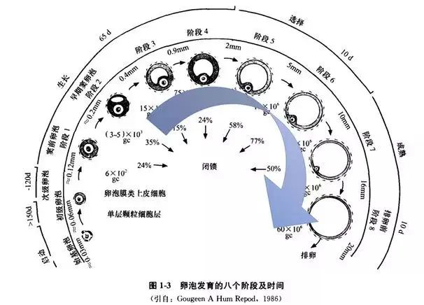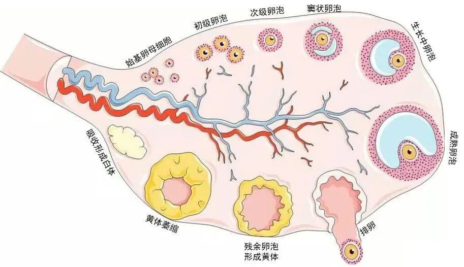 在这期间,卵泡一共经历了四种大小形态变化,即始基卵泡、初级卵泡、次级卵泡以及三级卵泡。